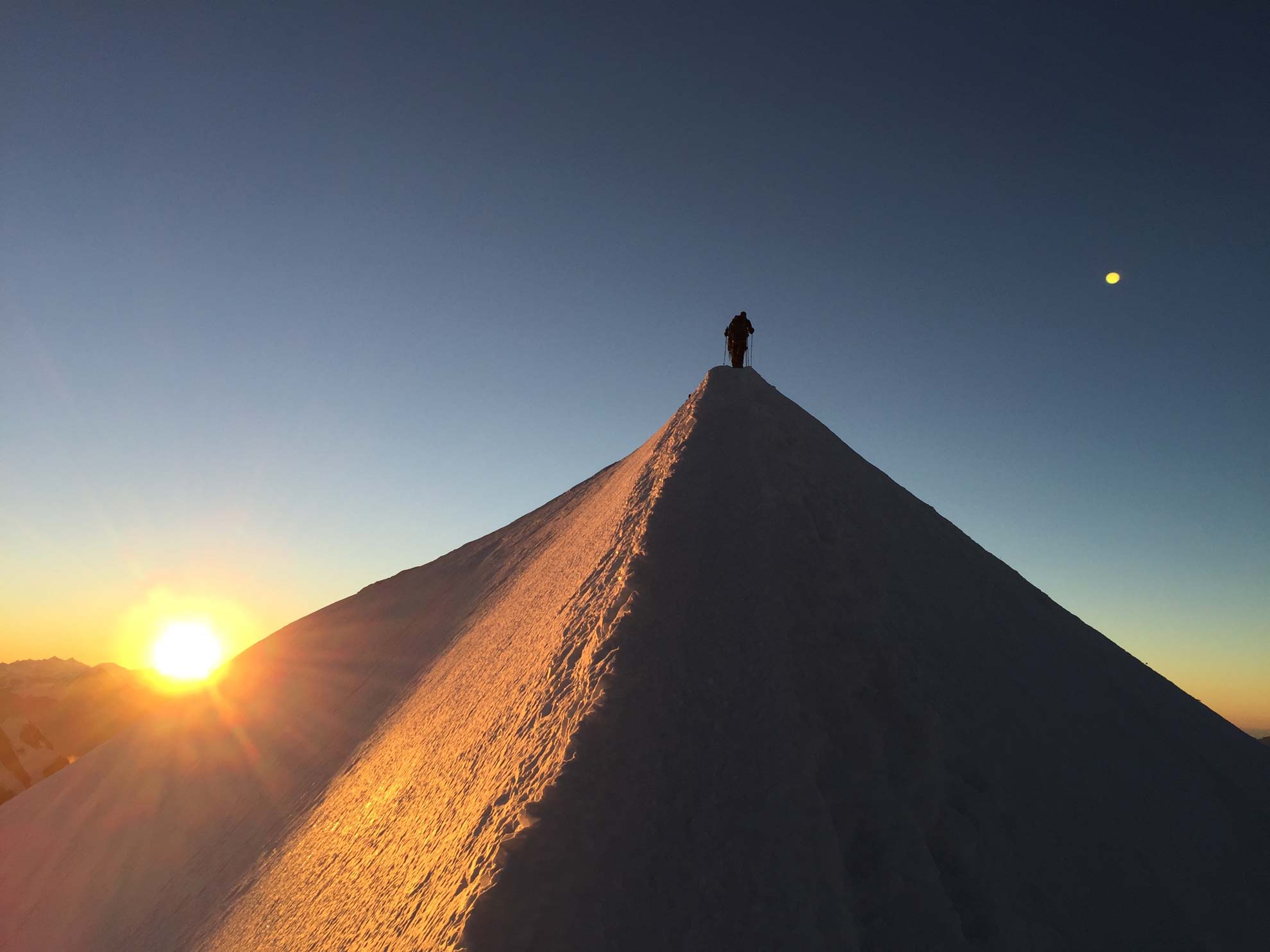 Los primeros rallos del amanecer nos sorprenden minutos antes de llegar a la cima, la arista pierde pendiente y se hace mas suave poco a poco hasta llegar a un gran plató de nieve con huellas recientes en la nieve de las primeras cordadas que llegaron delante de nosotros.