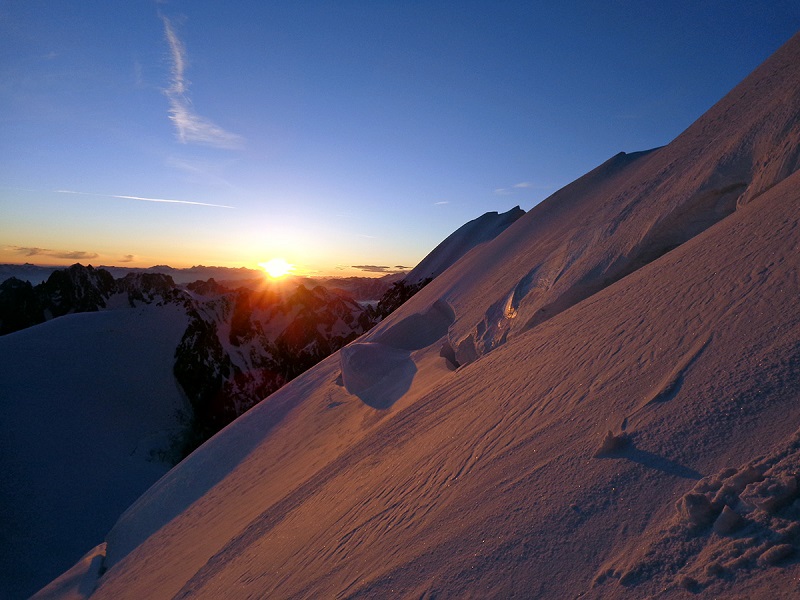 La luz del nuevo día nos sorprende poco a poco y sin darnos cuenta ya no es necesaria la luz de nuestros frontales para progresar. Comenzamos la arista de las Bosses. Ultima parte antes de esta ascensión. Un afilado paso de nieve de casi un kilometro que separa Italia y Francia a cada lado.