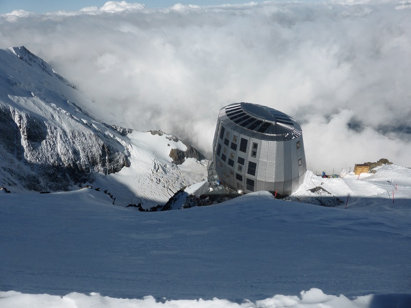 Después una inclinada de pala de nieve o hielo según el momento del verano llegaremos a la cabaña de emergencia de Vallot a 4.362m, una caja de zapatos metálica instalada en este collado en 1892 financiada en parte por Joseph Vallot conocido astrónomo, geólogo y glaciologo de la época que quedo prendado por el Mont Blanc.